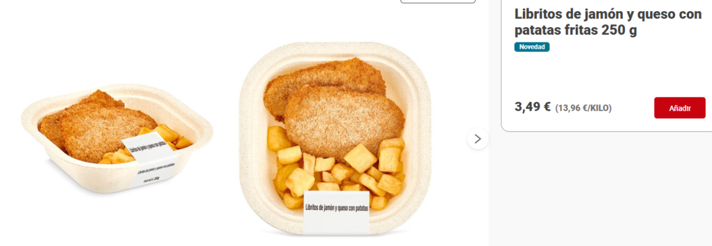 | Libritos de jamón y queso | 250 g | 3,49 € | Plato combinado |